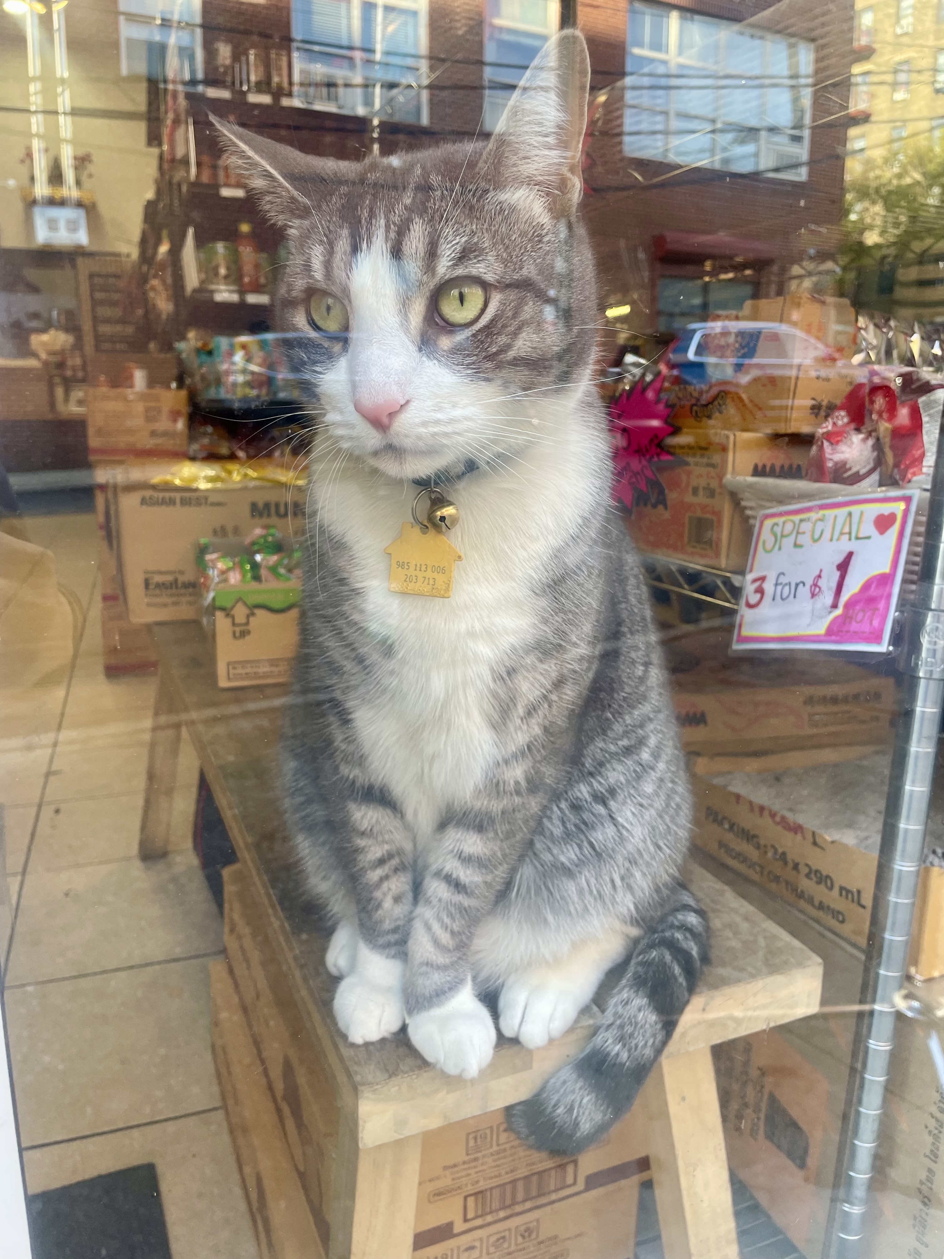 Picture: Hard-working cat at The 3 Aunties, a Thai Grocery Store in Woodside, Queens, NY.